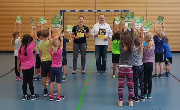Am 09.10.2018 kamen zwei engagierte Trainer des TSV Ismaning – Manfred Bamberger und Vero Kölzer, aktive Spielerin in der Bayernliga - zu uns. Jede Klasse lernte nun in einer Doppelstunde erste Techniken und Regeln des Handballspiels kennen und probierte diese begeistert aus. Den Abschluss bildete ein „echtes“ Handballspiel, an dem sich die Schülerinnen und Schüler mit großem Eifer beteiligten. Stolz nahm jedes Kind seine Urkunde entgegen und bedankte sich herzlich bei den beiden Trainern für dieses schöne Sporterlebnis.