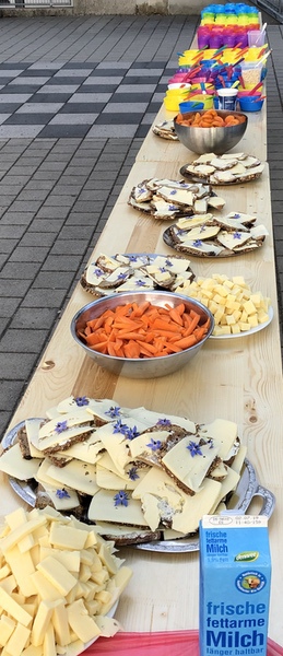 Seit einigen Monaten bereitet jeweils eine Klasse immer dienstags– gemeinsam mit ihrer Lehrkraft und einzelnen Eltern - ein gesundes Frühstück vor. Immer angeboten werden Milch, Joghurt und Käse. Diese Produkte bekommt die Schule aufgrund der Teilnahme am Milchprodukte-Förderprogramm der EU frisch geliefert. Vollkornbrot wird vom Elternbeirat organisiert. Zusätzlich überlegt sich jede Klasse, was sie noch darüber hinaus anbieten möchte (Obst, Gemüse, Müsli, Honig usw.).