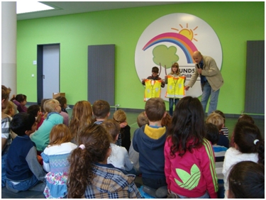 Zu diesem Anlass versammelten sich Ende Oktober alle Erstklässler der Grundschule Garching-West sowie die der Grundschule Hochbrück in der Aula. Dort hörten sie vom Nutzen einer solchen Kleidung, bevor Herr Gerhard Kölbl, 1.Vorstand des Motorsportclubs Garching, die leuchtenden Schutzwesten überreichte.